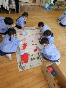 スポンジ、筆、風船、手…いろんな色で塗っていました。