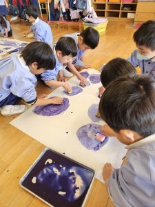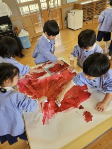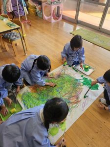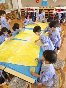 それぞれのクラスで大きな模造紙に色を塗っていました。